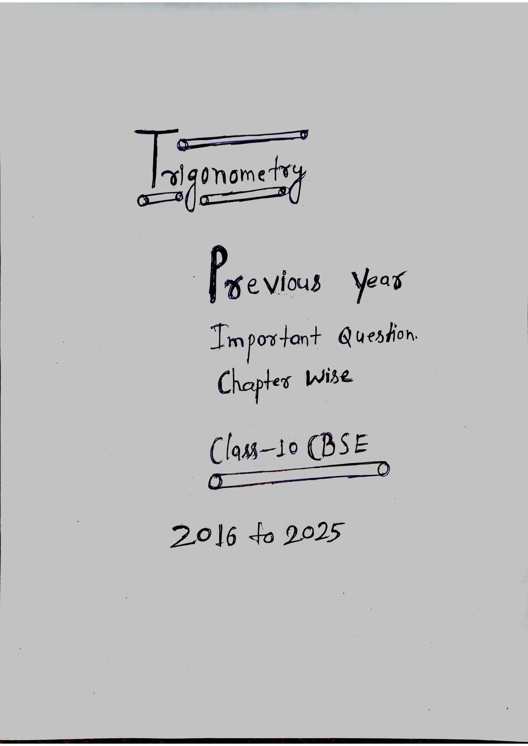 The Trigonometry – Previous Year Question Papers (2016–2025) is a carefully prepared digital practice resource for Class 10 CBSE Mathematics. It includes important and frequently asked questions from CBSE board examinations over the last 10 years, covering all major Trigonometry topics.